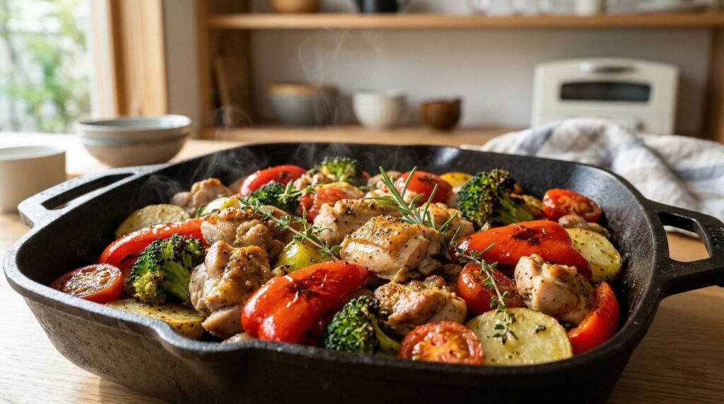 鶏むね肉はパサパサになりがちですが、グリルパンのフタを使った蒸し焼き効果でしっとり柔らかく仕上がります。さらに、アラジンの高温で野菜の甘みを引き出し、ヘルシーなのにボリューム満点のメインディッシュが完成します。
