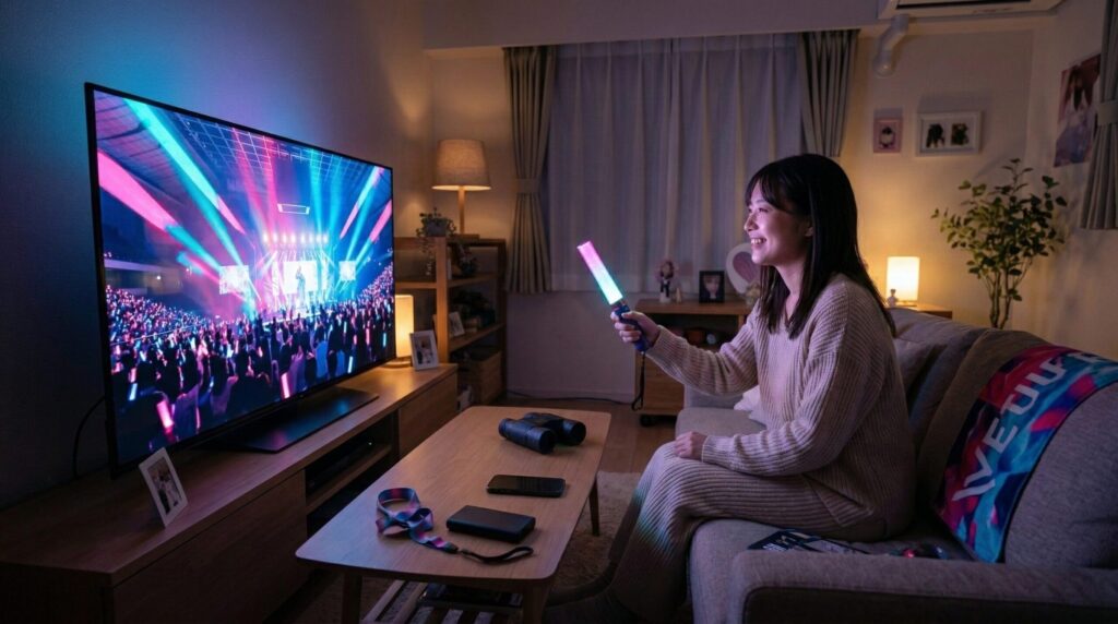 - ペンライトを振りながら視聴する:自宅でもペンライトを振れば、気分は完全にライブ会場です。推しカラーに光らせて全力で応援しましょう