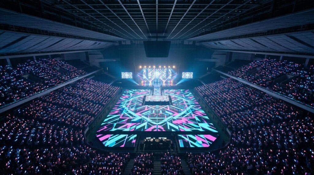 次に、AR演出との相性が挙げられます。VTuberのライブでは、ステージ上にARキャラクターが出現したり、会場全体を包み込むような映像演出が行われます。こうした演出は、高い位置から見ることで立体感がより際立ち、没入感が増すのです。